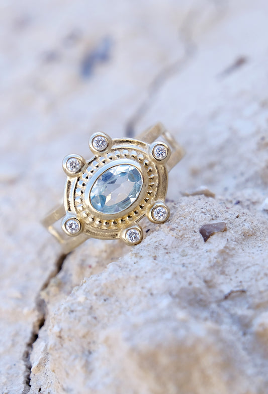 BHAVANI Ring 14K Gold Natural Aquamarine and Natural White Diamonds