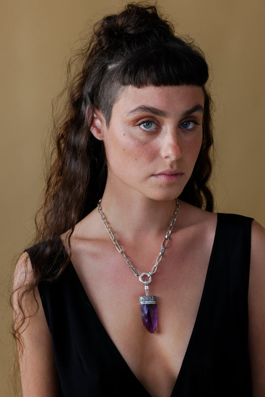 OOAK- Large Amethyst Crystal Pendant, Oversized Chain Linked Necklace